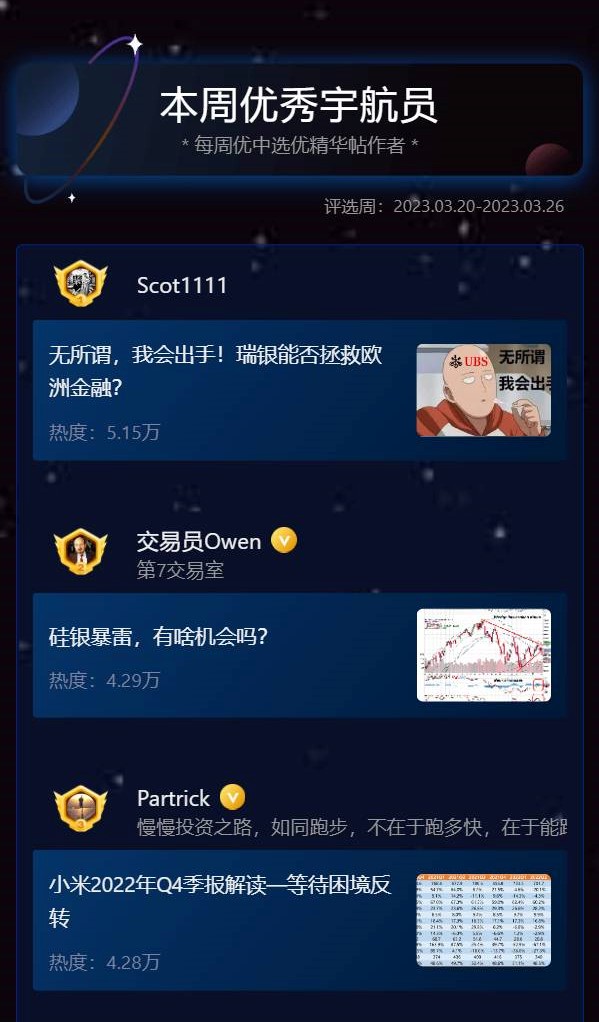 太空探索计划是老虎社区发起的内容激励计划,邀请优质创作者分享自己对金融、股票的见解/心得/分析。凡是参与活动的创作者,都有机会获得虎币,代金券等实物奖励,还有机会获得荣誉勋章,流量支持,官方推荐等多重激励。