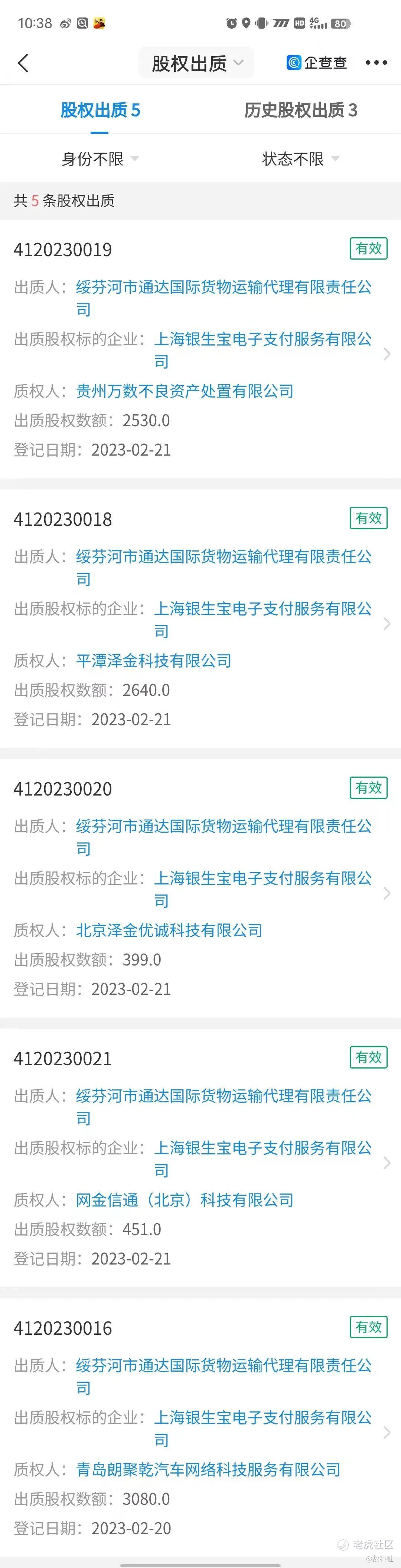 2023年2月21日,银生宝出现了多条股权出质登记信息,大股东通达国际货物运输代理将其持有的全部股权,出质给青岛朗聚乾汽车网络科技服务有限公司、网金信通(北京)科技有限公司(简称“网金信通”)、北京泽金优诚科技有限公司(简称“泽金优诚”)、贵州万数不良资产处置有限公司、平潭泽金科技有限公司(简称“平潭泽金”)等五家公司。