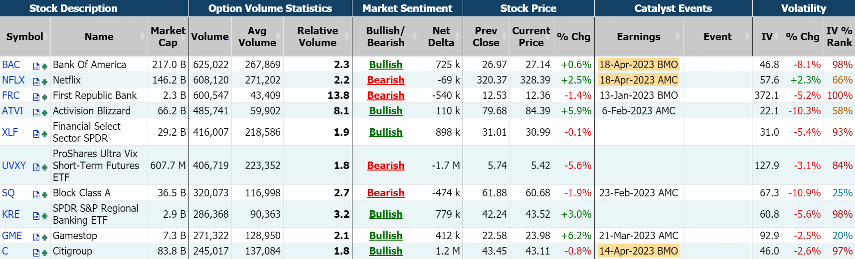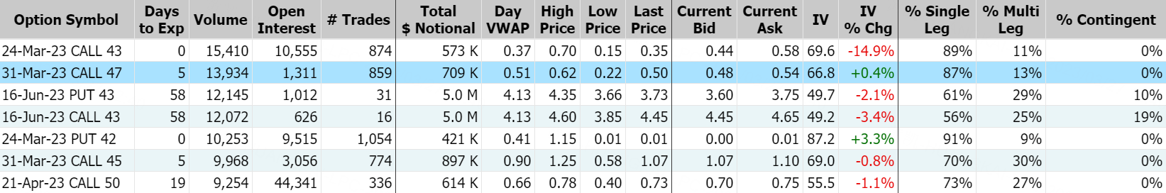 区域银行指数ETF(KRE)上周五张超3%,报43.52美元。2023年3月31日到期行权价为47美元看涨期权的成交量特别高,成交量为13,934张。