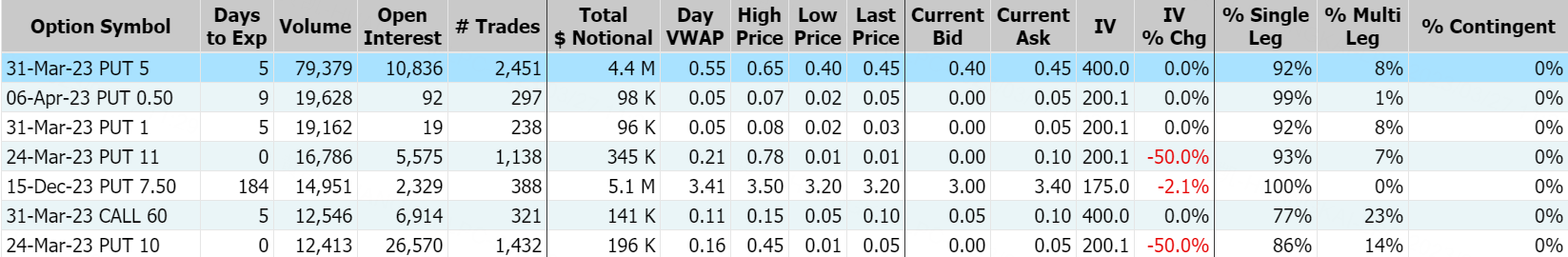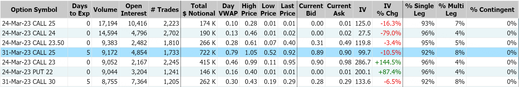 游戏驿站上周五张超6%,报23.98美元。2023年3月31日到期行权价为25美元看涨期权的成交量特别高,成交量为9,172张。(注:由于该股短期振幅较大,建议投资者切勿追高)