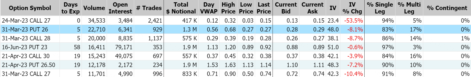美国银行上周五上涨0.63%,报27,14美元。期权合约成交62.71万张,看涨期权占全部期权交易的51%。2023年3月31日到期行权价为26美元看跌期权的成交量特别高,成交量为22,710张。