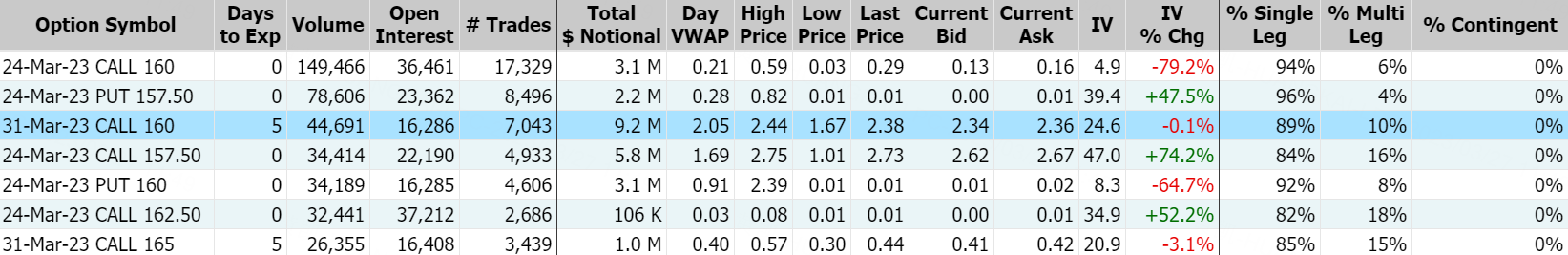 苹果上周五涨0.83%,报160,25美元。期权合约成交102万张,看涨期权占全部期权交易的51%。2023年3月31日到期行权价为26美元看涨期权的成交量特别高,成交量为44,691张。