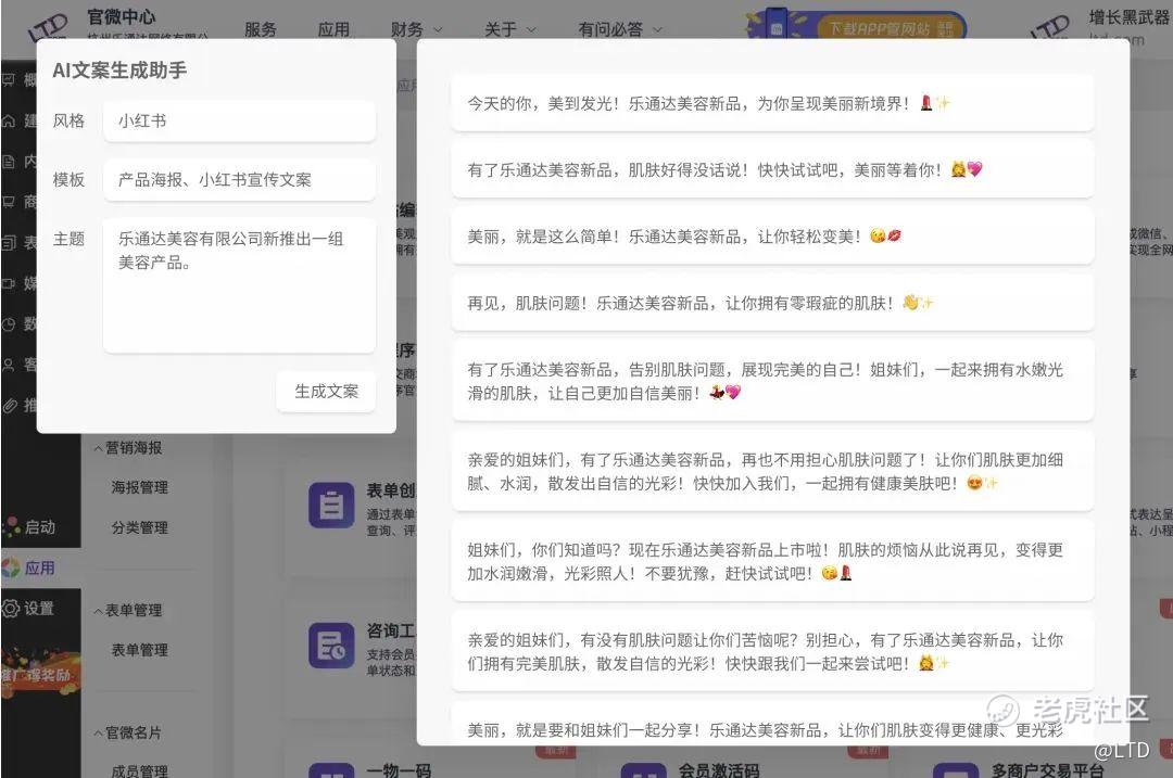 在数字化官网的四大能力基础上,针对数字化官网运营过的典型应用场景,LTD将ChatGPT与营销SaaS进行深度整合,以满足不同行业和领域的需求。无论是内容生成、客户服务、营销推广,还是数据分析与挖掘,都能提供AI支持,助力企业提升效率、降低成本。