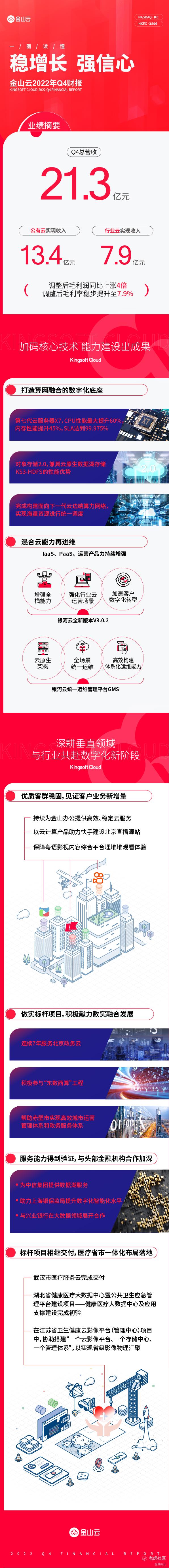 财报显示,金山云Q4营收21.3亿元,公有云和行业云分别实现收入13.4亿元和7.9亿元。调整后毛利润同比上涨4倍,调整后毛利率由2022年Q3的6.3%进一步提升至7.9%,经营现金流连续三个季度实现正向流入。