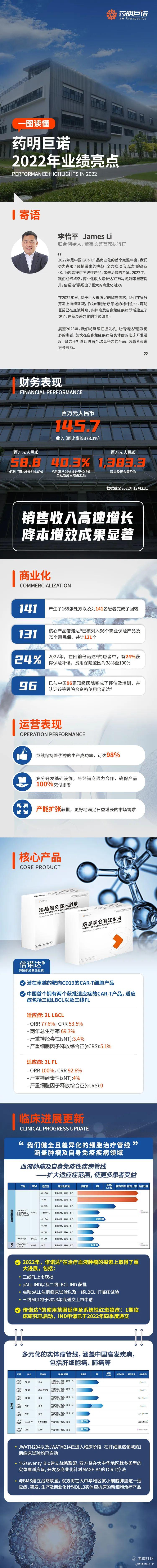 智通财经APP获悉,3月29日,药明巨诺-B(02126) $药明巨诺-B(02126)$ 发布截至2022年12月31日止年度业绩,公司于期间内实现收入1.46亿人民币,同比增加373.1%。