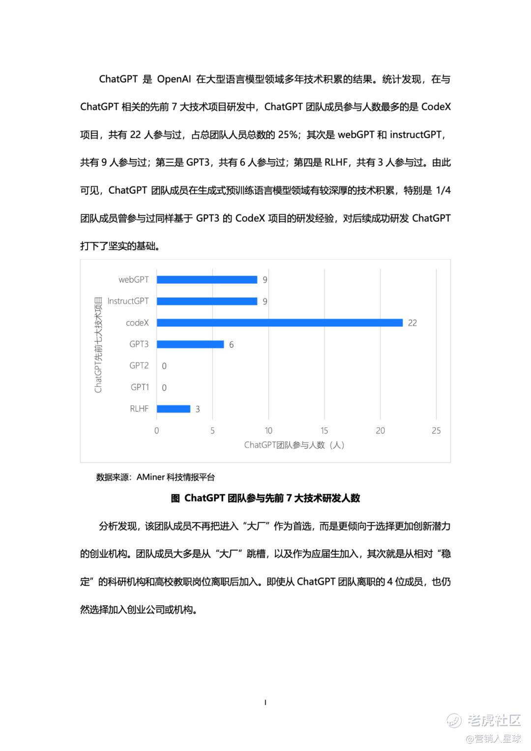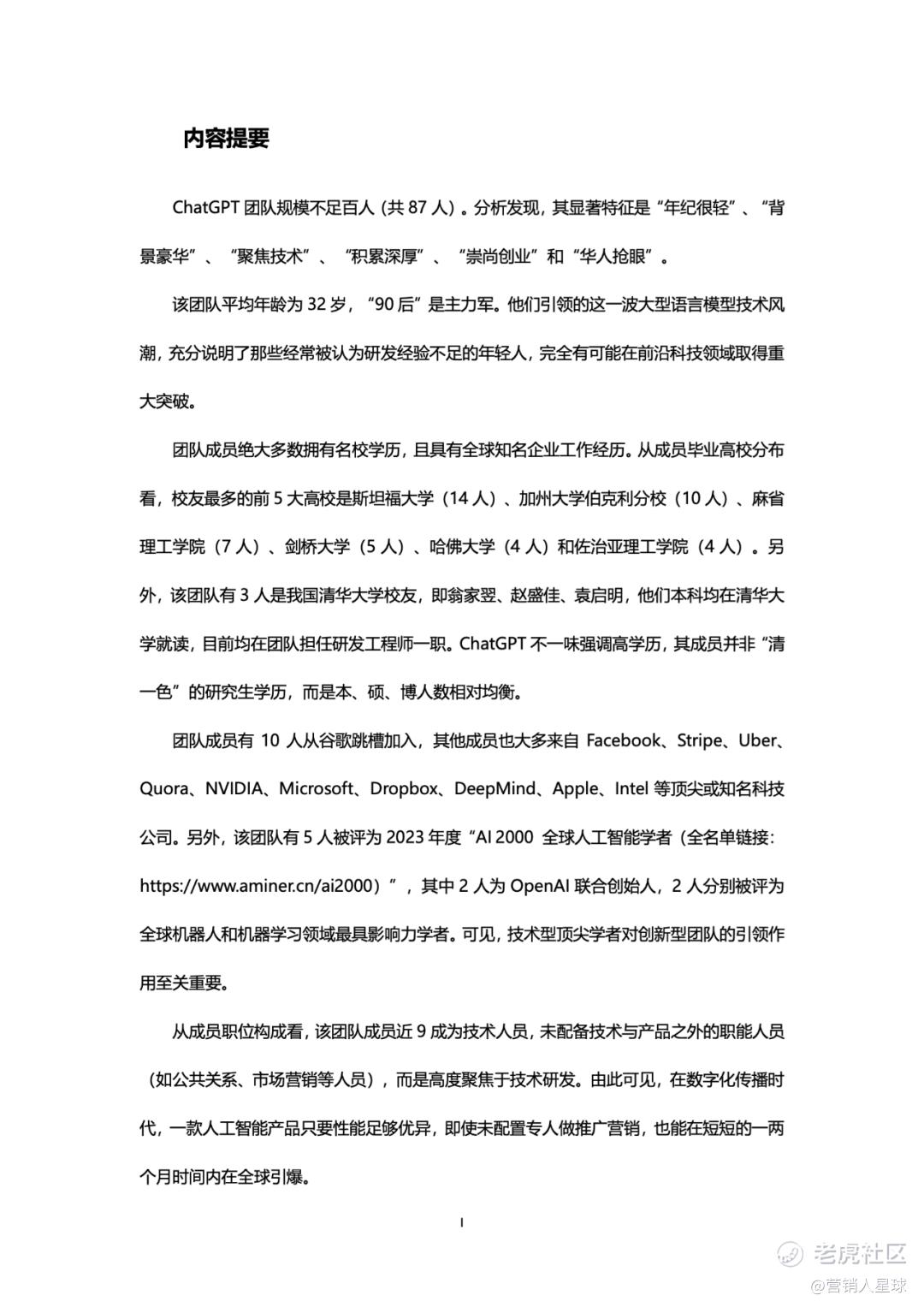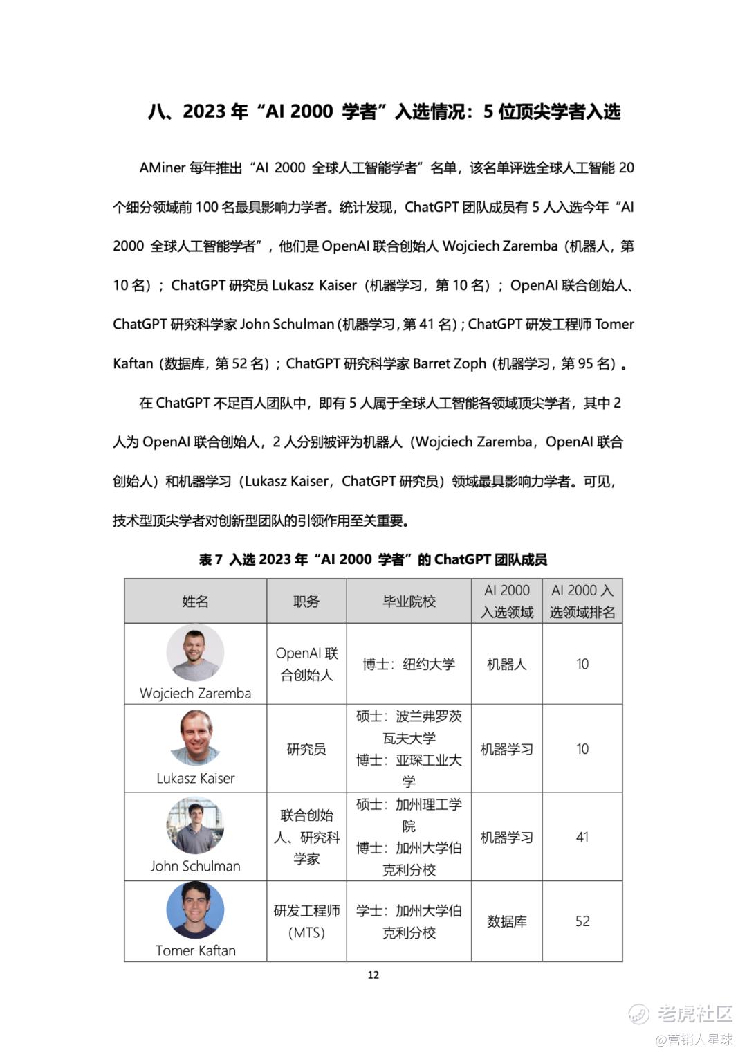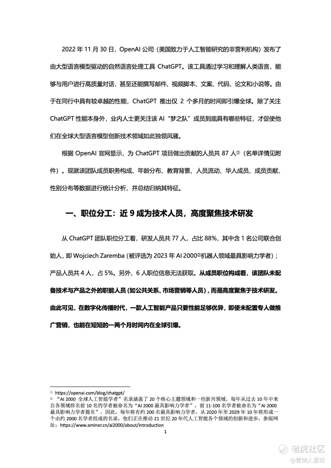 从 ChatGPT 团队职位分工看,研发人员共 77 人,占比 88%,其中含 1 名公司联合创 始人,即 Wojciech Zaremba(被评选为 2023 年 AI 20002机器人领域最具影响力学者); 产品人员共 4 人,占 5%。另外,6 人职位信息无法获取。从成员职位构成看,该团队未配 备技术与产品之外的职能人员(如公共关系、市场营销等人员),而是高度聚焦于技术研发。由此可见,在数字化传播时代,一款人工智能产品只要性能足够优异,即使未配置专人做推 广营销,也能在短短的一两个月时间内在全球引爆。