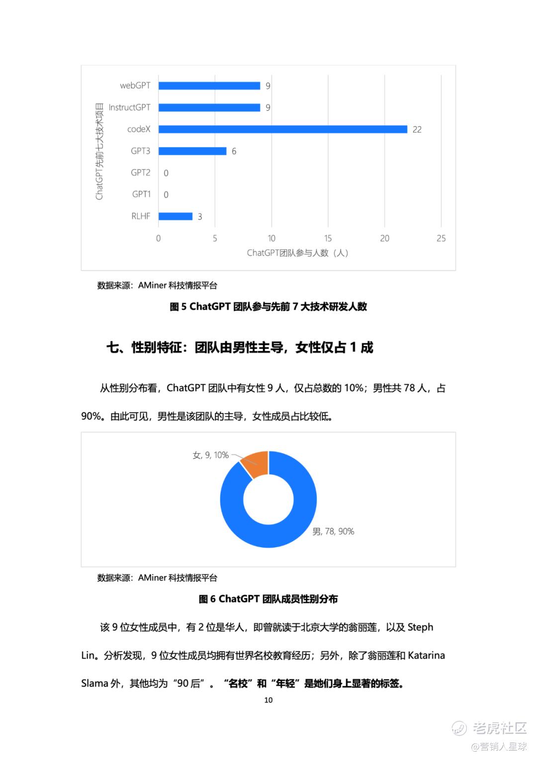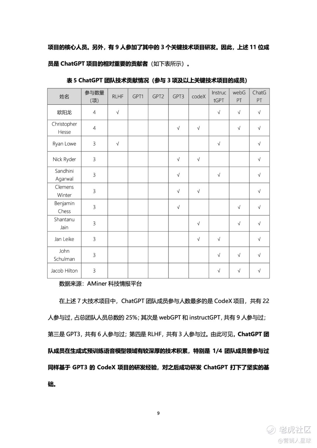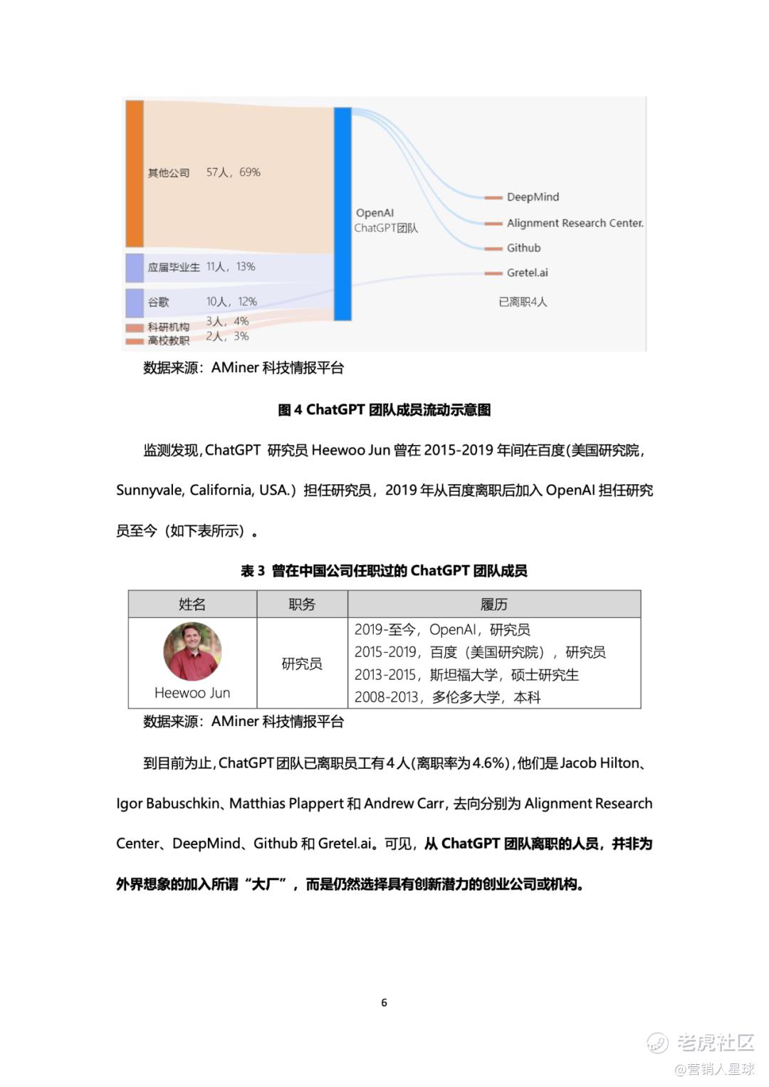 从 ChatGPT 团队职位分工看,研发人员共 77 人,占比 88%,其中含 1 名公司联合创 始人,即 Wojciech Zaremba(被评选为 2023 年 AI 20002机器人领域最具影响力学者); 产品人员共 4 人,占 5%。另外,6 人职位信息无法获取。从成员职位构成看,该团队未配 备技术与产品之外的职能人员(如公共关系、市场营销等人员),而是高度聚焦于技术研发。由此可见,在数字化传播时代,一款人工智能产品只要性能足够优异,即使未配置专人做推 广营销,也能在短短的一两个月时间内在全球引爆。