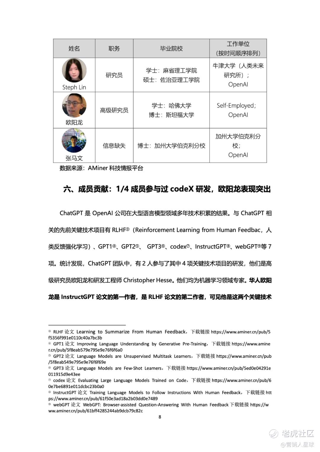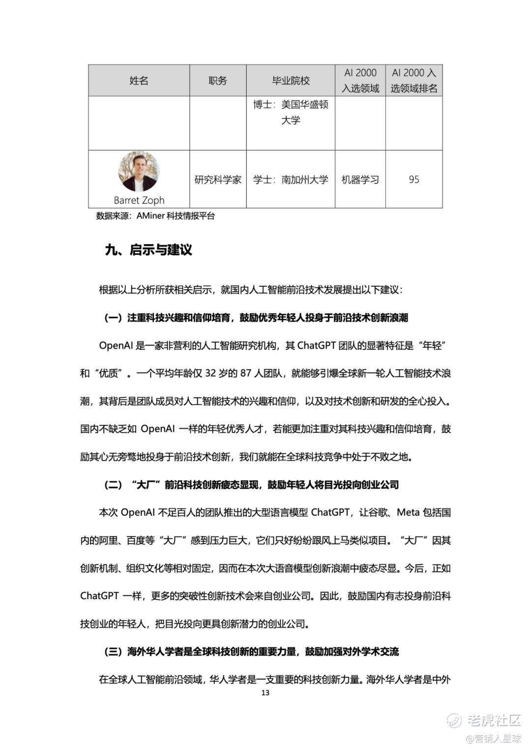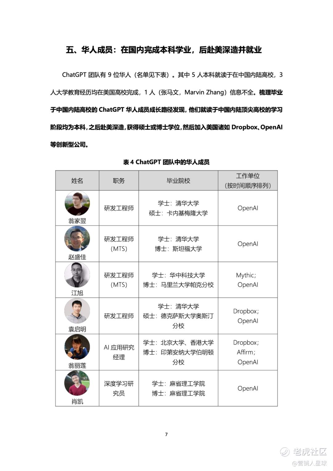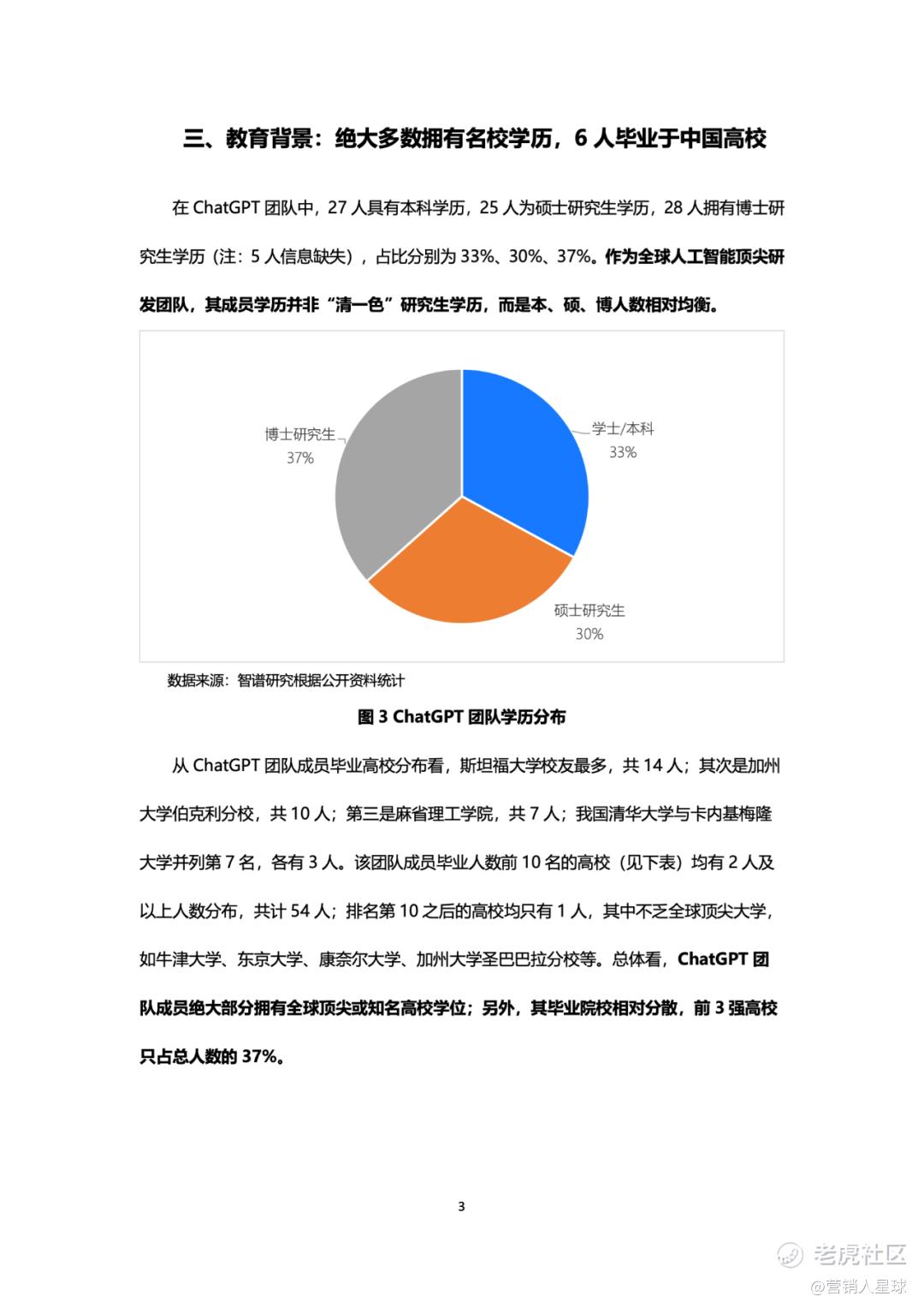 从 ChatGPT 团队职位分工看,研发人员共 77 人,占比 88%,其中含 1 名公司联合创 始人,即 Wojciech Zaremba(被评选为 2023 年 AI 20002机器人领域最具影响力学者); 产品人员共 4 人,占 5%。另外,6 人职位信息无法获取。从成员职位构成看,该团队未配 备技术与产品之外的职能人员(如公共关系、市场营销等人员),而是高度聚焦于技术研发。由此可见,在数字化传播时代,一款人工智能产品只要性能足够优异,即使未配置专人做推 广营销,也能在短短的一两个月时间内在全球引爆。