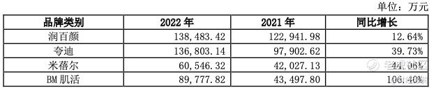功能性护肤业务目前已形成四大护肤品牌:主打透明质酸护肤的润百颜、主打冻龄抗初老的夸迪、针对敏感肌护肤的米蓓尔和运用新发酵成分的BM肌活。根据年报披露,继润百颜之后,夸迪成为第二个收入超过10亿元的品牌,BM肌活22年收入8.98亿元也有望在2023年成为第三个收入迈入10亿关卡的品牌。