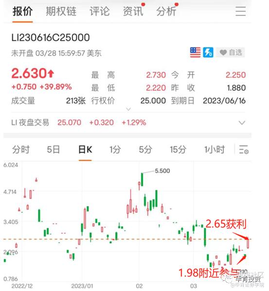 本案例是期权的角度参与理想汽车LI,购入理想汽车Li6月到期的行权价25的看涨期权,参与到3月28日理想汽车的涨幅,并收获到30%的增值。
