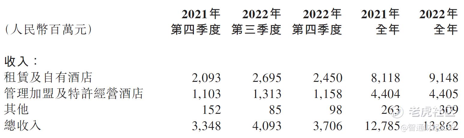 拆分收入结构来看,2022年华住的租赁及自有酒店的收入为91亿元,同比增加了12.7%;管理加盟及特许经营酒店收入为44亿元,与上一年度持平。