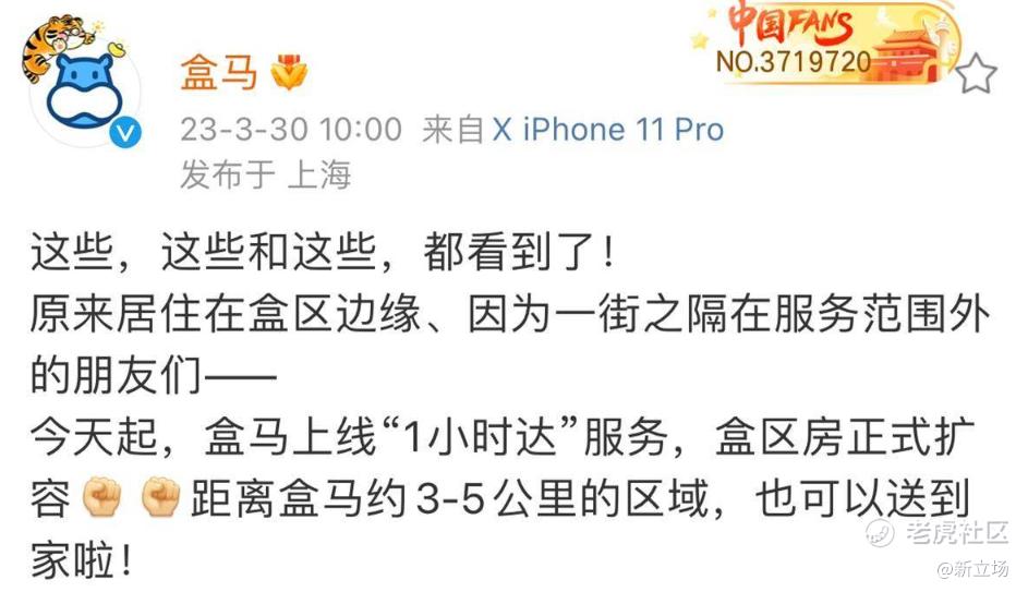 “自负盈亏”的盒马同样有了新动作。3月30日,盒马官微发布公告称,在此前盒马“三公里30分钟送达”的基础上,盒区房扩容至“3-5公里”,且上线“一小时达”服务。