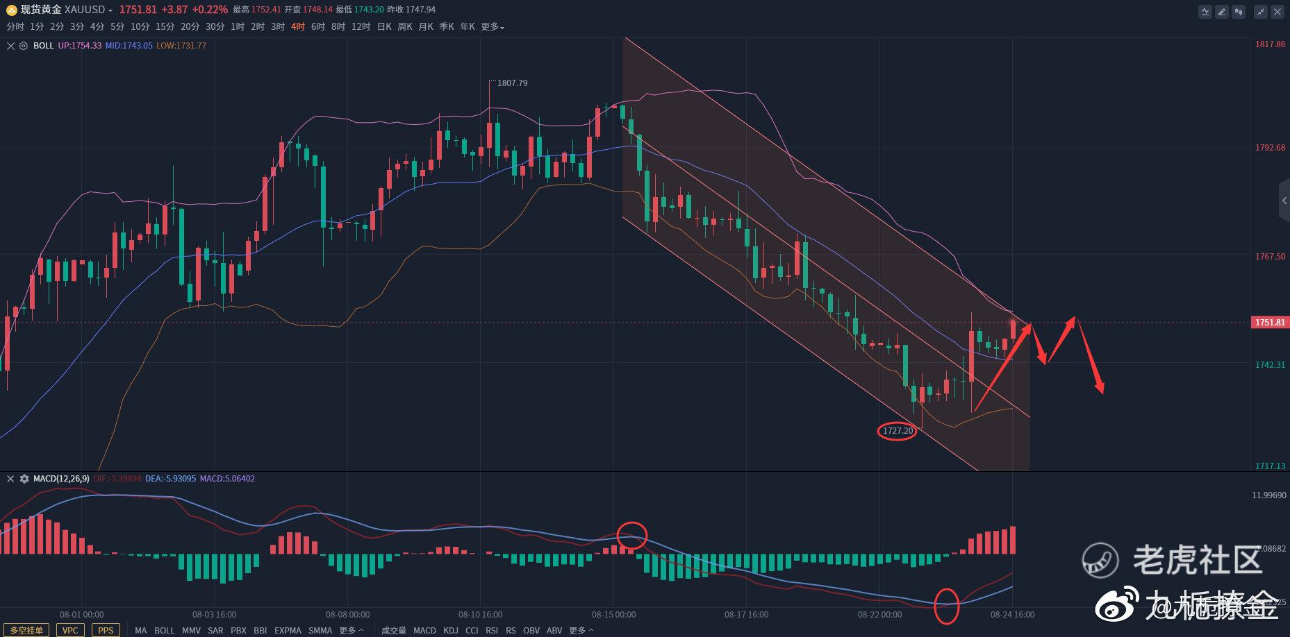 今天上午的做单思路,区间是1743——1740,目前这个位置还是需要在等一下,看今天会不会给到机会。黄金在昨天上涨之后,就在1748——1744之间徘徊,现在是到1751了,今天的做单思路还可以再等一等,看美盘时段会不会出现回落。