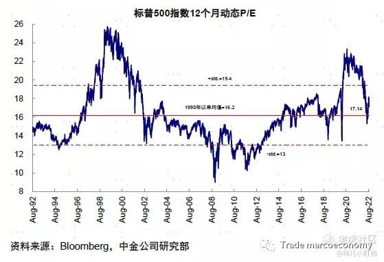 那么对于整个市场而言,毫无疑问正在进行和即将到来的大概率是“紧缩交易”,也就是说美股股指当前仍然面临下行的压力(起码是1~2月内),不管是Eps forecast还是实际利率的压力:市场对于衰退的定价仍然不充分,下图就是sp500 Q2 earning ex-energy的表现,很清晰能看出来股票市场对于分子端的下滑没有完全计价。对于实际利率,Powell已经明说了,短期不要预计大幅度下滑,所以分母端也不要太期待给股指带来正向收益。而且,股指根据估值来看(借用中金的图),这个位置略有尴尬。