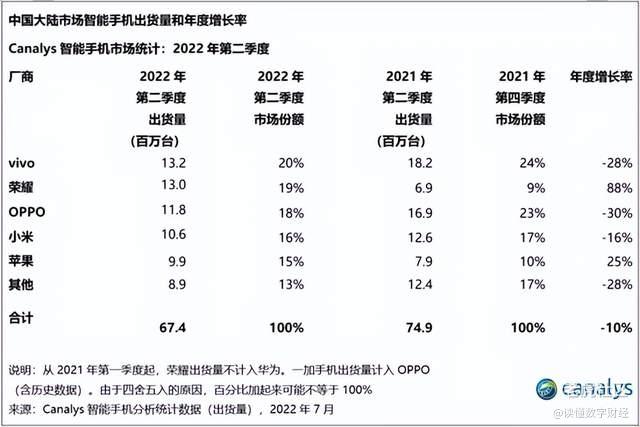 Canalys数据显示,二季度荣耀在中国大陆的出货量达到1300万台,同比增长88%,出货量排名第二,而在其他机构如Strategy Analytics、IDC的数据中,荣耀销量已经跃居第一。