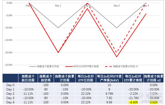 从上面的计算结果我们可以看到,在追踪标的经历四天大幅波动且无明显方向后,其价格回到原点,累积回报为0%, 但追踪此标的的 2倍杠杆ETF这时候的累计表现为亏损4.4%。