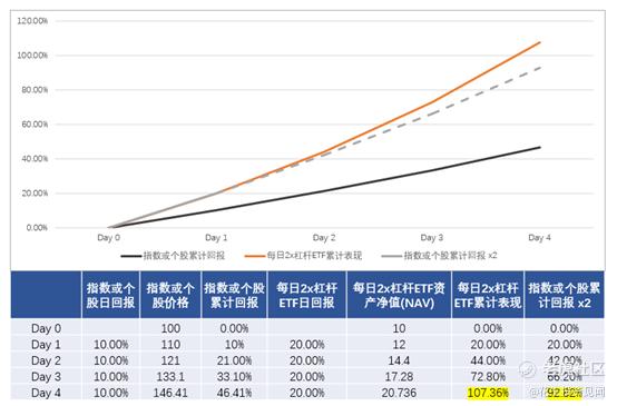 当然,如果市场开始出现单边行情的时候,每天的重新平衡也会同样能够增强长期报酬,同样我们上面的例子为例,当出现明显的单边上涨的时候,两倍ETF产生的收益高达107.36%,高于其追踪标的的累计报酬直接乘以2倍。