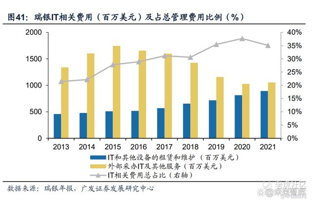 此外,瑞银还致力于利用科技赋能投顾团队,通过自主研发、合作研发及并购获取 等渠道创建瑞银专属的数字化金融交易和投资平台,进一步加强投顾团队的产能效 率。瑞银集团在科技领域加大投入,重点布局云技术、机器人、人工智能等领域,并 利用技术成果赋能投顾团队。瑞银为投顾团队提供UBS connect、UBS key trader、UBS财富管理搜索平台等瑞银内部传统的IT支持平台和信息搜索平台,助力投顾人 员监控市场表现、完成高效交易。在将已有技术投入财富管理生产的同时,瑞银团 队仍在持续获取新的科技产品,获取渠道从自主研发、合作研发到收购产品不一而 足。根据瑞银年报披露,公司IT相关管理费用占总管理费用比例保持稳定增长趋势, 从2013年的21%升至2021年的35%。