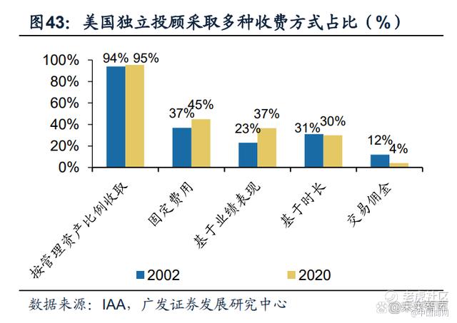 在美国,境内外金融机构/个人向美国客户提供证券投资建议,须向SEC申请注册RIA(Registered Investment Advisor)牌照。2000年至2021年,美国注册投资顾 问管理客户资产由20.3万亿美元提升至128.4万亿美元,年化复合增速达到9.2%, 其中全权委托方式的占比提升至91%。 独立投顾收费方式一般以按管理客户资产规模的比例收取,此外,投顾会采用多种 收费方式,如固定费用、基于超额业绩的提成费用等,而按交易次数收取的佣金占 比呈现下降趋势。