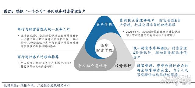 瑞银集团围绕财富管理业务为核心,资管、商行、投行其他三个部门在服务各自客户外,共享专业能力服务财富管理客户需求。瑞银财富管理和投资银行合作设立全 球家庭办公室(GFO,Global Family Office),跨部门平台以提供综合产品和服务, 以更丰富的投资解决方案捕捉更多的投资机会。瑞银全球家族办公室主要服务于净 资产5亿法郎以上的超高净值客户,并且通过扩张其在美国设立的美国家族办公室解 决方案团队,扩大财富管理规模和专业能力。