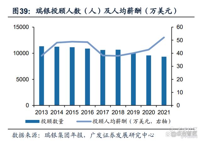 2013年至2021年,瑞银投顾人数从11333名缩减到9329名,人均管理可投资客户资 产从1.9亿美元上升至3.5亿美元,人均财富管理收入贡献从134万美元上升至208万 美元。