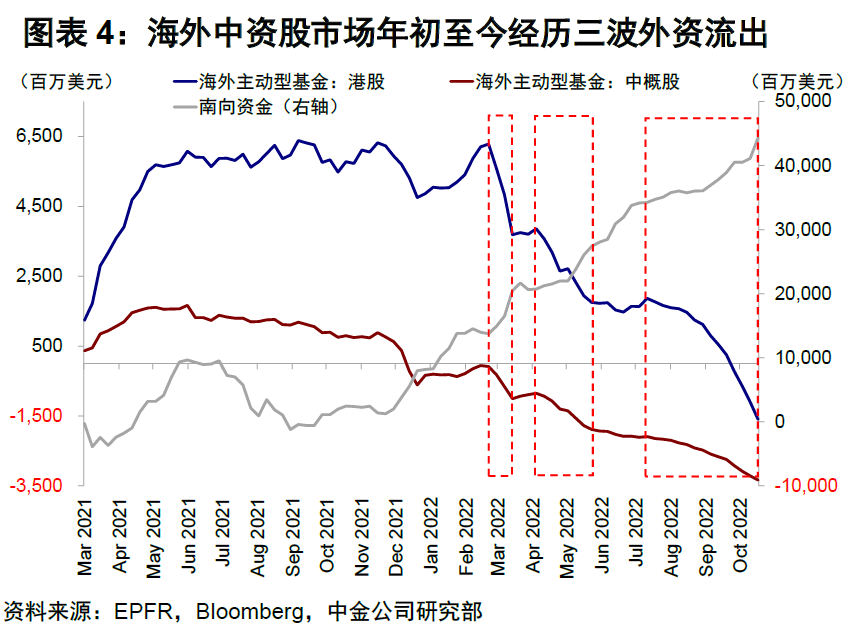 本轮自2021年8月高点以来海外主动基金累计流出109.8亿美元,小于2018-2019年或2013-2017年,但是此轮流出对股价的影响似乎更大。对股价更关键的因素可能是定价权归属。