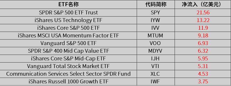 上周多只追踪标普500指数的ETF净流入居前,其中,SPDR S&P 500 ETF Trust在上周流入金额为21.56亿美元,净流入TOP10中排名第一,其次,Vanguard S&P 500 ETF、iShares Core S&P Mid-Cap ETF分别净流入6.93亿美元、净流入5.95亿美元;由此可见,投资者对市场开始逐步变乐观。