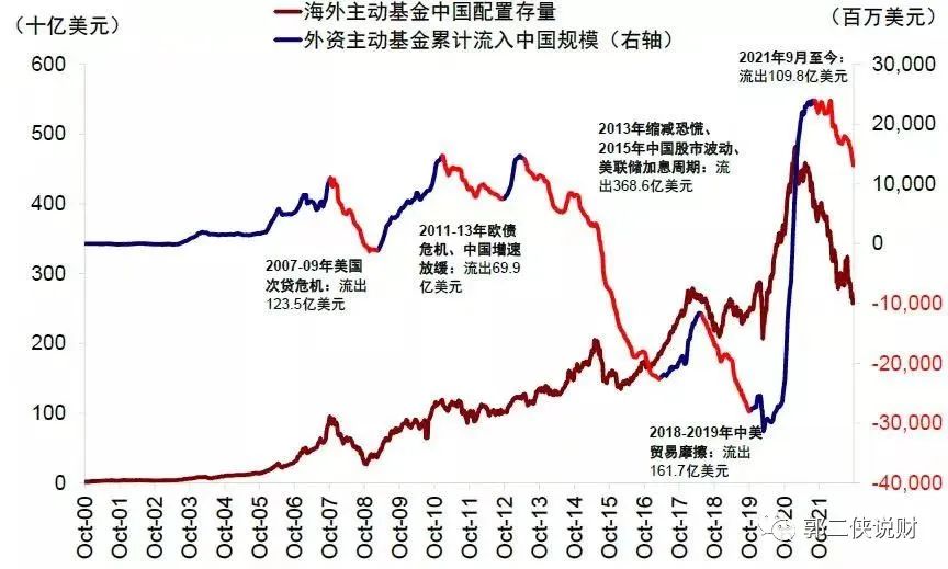 但根据中金的测算,本轮自2021年8月高点以来海外主动基金累计流出110亿美元,无论规模还是持续时间都弱于2018-2019年或2013-2017年,而且流出规模不及2020-2021年期间流入规模的一半。