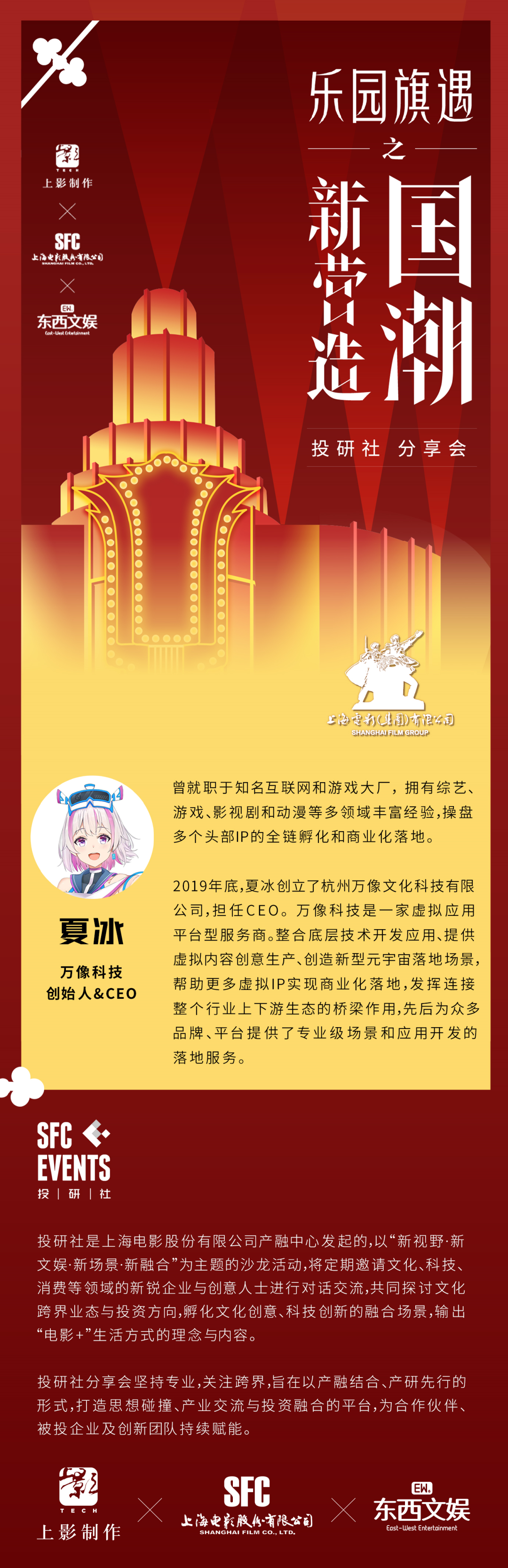 以下为万像科技创始人&CEO夏冰在近期的SFC EVENTS投研社“国潮新营造”分享会上的发言纪要。本期投研社分享会由上影股份、上影制作、东西文娱联合举办。东西文娱在沉浸式娱乐、文娱+潮流消费新业态等方面保持着长期跟踪与研究。点击下图了解会议现场。