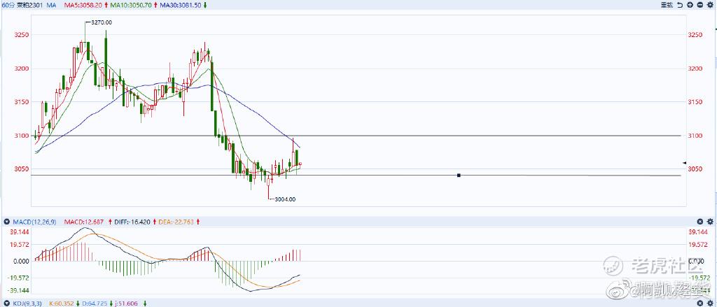 菜粕主力合约今日开盘价3060,最新价3053,昨日晚间菜粕依托3040一线小幅反弹,未站稳上方3100压力位回落,昨日操作建议尝试短多一次,目标3075,晚间成功止盈离场。早间开盘菜粕低开低走,菜粕回踩5日均线,下方支撑3040附近,MACD指标,快慢线维持上行,红色动能柱达到顶峰,目前反弹乏力,整体可以看作3040-3100区间行情对待;KDJ指标,三线向下发散,日内菜粕持续回调,目前下方3040附近支撑较为强劲,日内操作回调低多为主,未跌破3040一线支撑可短多,目标上方3080附近。