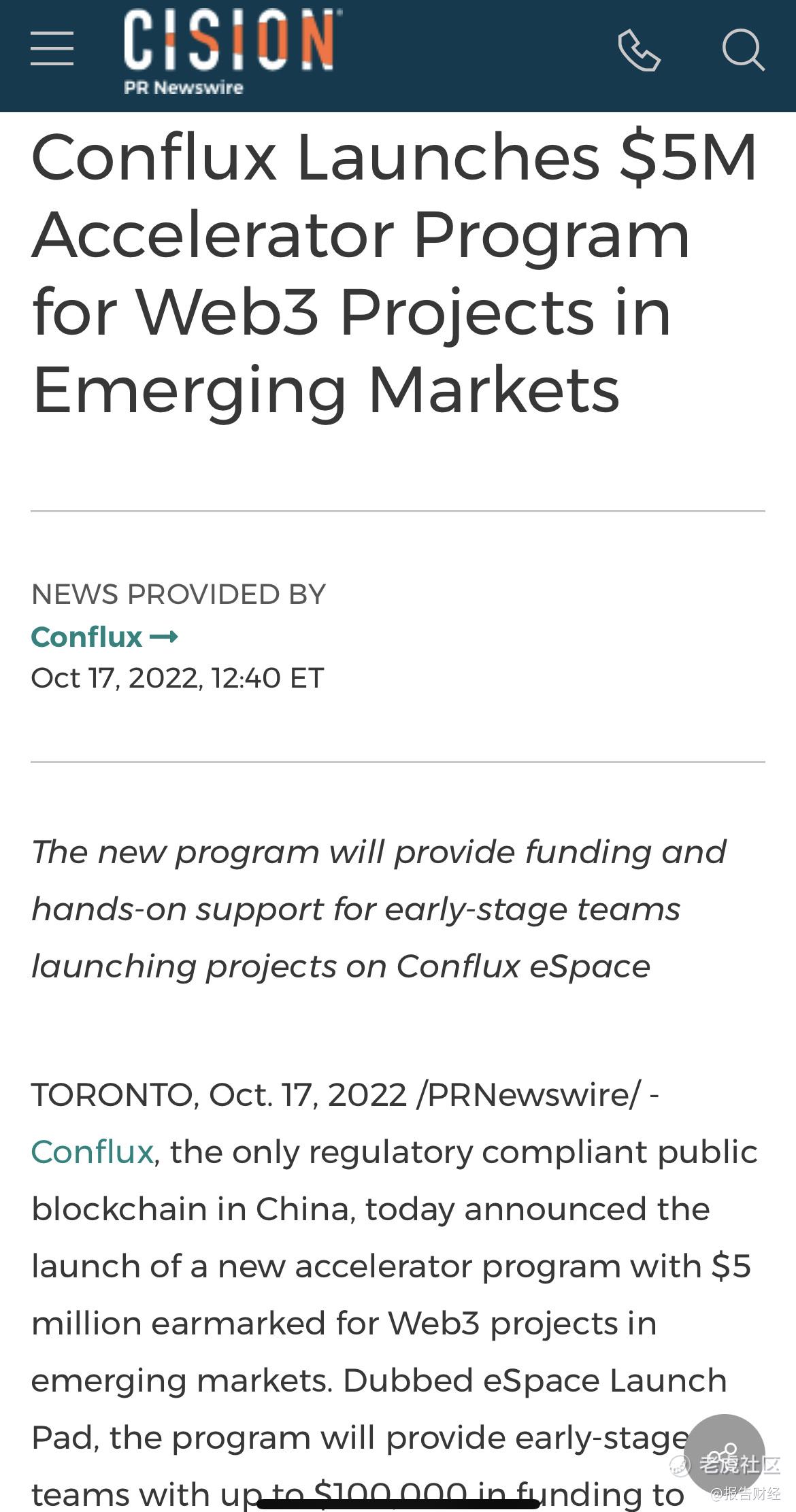 10 月 18 日,公链 Conflux 宣布启动加速器计划 eSpace Launch Pad,将为创新的 Web3 项目拨款 500 万美元,早期团队最高可获得 10 万美元的资金奖励,以在 Conflux eSpace 上启动项目。