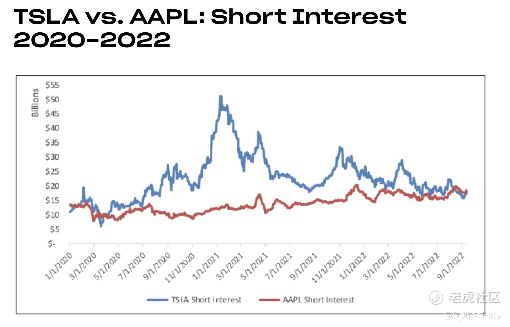 特斯拉自2020年4月以来,连续864天占据美股做空股数的首位。截至9月13日,AAPL的做空仓位为184.4亿美元,做空1.1286亿股,占流通股的0.70%;而TSLA的做空头寸为174.4亿美元,做空5730万股,占流通股的2.19%。