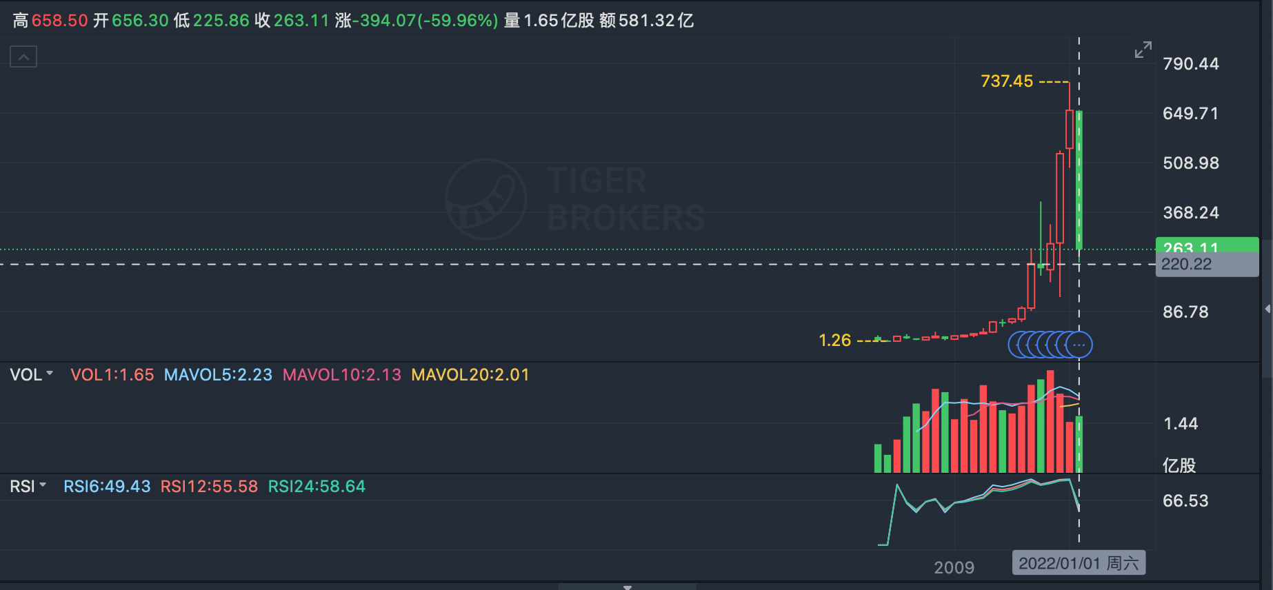 但是,如果大家以为它的股价还会继续涨,而在656.54美元买入,恐怕已损失惨重,其最新价只有30.00美元,较高位折让了95.4%,也就是说一日内市值蒸发逾95%——玩的就是心跳。