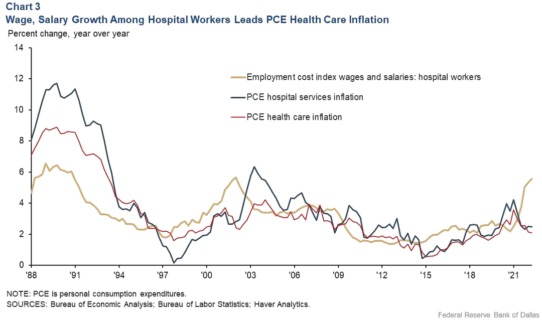 医疗是服务业的另一个大头,但消息依然不乐观。自2022年以来,美国医疗保健服务业的通胀率一直在2%左右,接近疫情水平。然而,如果考虑到最近医疗工作者工资上涨的速度,这种情况可能会改变。根据下图可以了解到,从历史上看,医院工作人员的工资增长一般领先于PCE医院服务通胀和PCE医疗保健通胀约一年,这也被计算这些系列之间的交叉相关关系所证实。