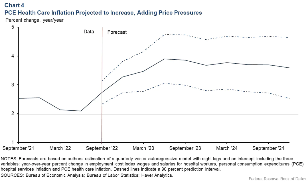 根据这个模型模型,美国服务业的医疗通胀率将从2022年第二季度的2.1%上升到2023年第二季度的3.9%,并将在2024年保持在3.5%以上(如下图)。
