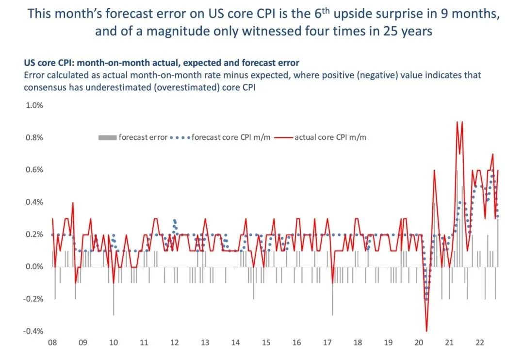 现在问题来了。 尽管今年美联储加息+200bp,资产负债表收缩,美国经济几乎停滞不前(第一季度和第二季度GDP萎缩,第三季度增长1.5%),但是美国核心通胀率今年每月都在0.3%至0.7%之间运行。在9个月中,有6个月出乎意料地上升,两次出现了预期之外的下降,仅有一次符合预期。2022年9月13日这个数据给市场的惊喜(比预期高0.3%)在过去25年中只出现过4次,突出表明全球分析师们还没有真正掌握美国通胀的宏观和微观驱动因素。
