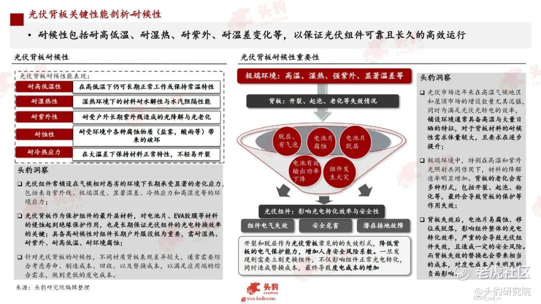 光伏组件常铺设在气候相对恶劣的环境下长期承受显著的老化应力,包括来自紫外线、极端温度、显著温差、冷热应力和高湿度等的环境应力;光伏背板作为保护组件的最外层材料,对电池片、EVA胶膜等材料的侵蚀起到绝缘保护作用,也是长期保证光伏组件的光电转换效率的关键;具备高耐候性对组件长期户外服役极为重要,需耐湿热、耐紫外、耐高低温、耐环境腐蚀;针对光伏背板的耐候性,不同材质背板表现差异较大,通常需要综合考虑寿命、制造成本、回收、以及替换成本,以满足应用端的综合需求,做到更低的度电成本。
