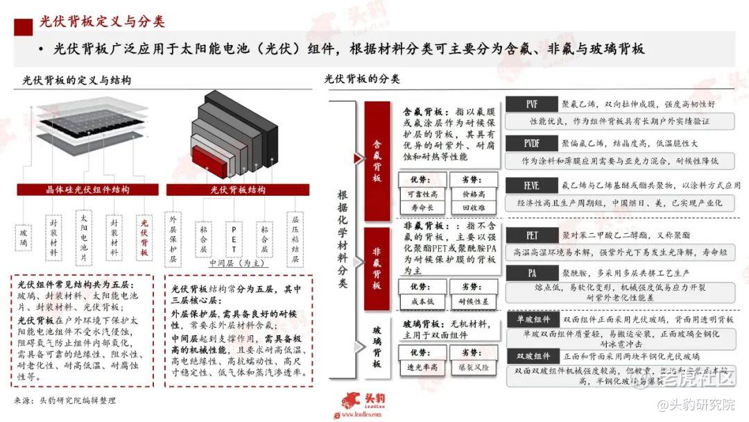 光伏背板广泛应用于太阳能电池(光伏)组件,根据材料分类可主要分为含氟、非氟与玻璃背板。