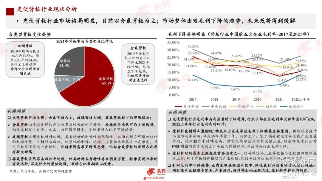 光伏背板广泛应用于太阳能电池(光伏)组件,在国家政策的整体推动下,光伏产业进入爆发式增长阶段,同时将带动背板行业的快速发展与规模扩张。目前背板行业整体呈现,含氟背板为主,玻璃背板为辅,非氟背板较少的市场格局。近年光伏背板行业毛利率具有显著的下降趋势,行业头部5家企业最低已降至10%以下,主要由原材料成本上涨导致,企业积极采取应对措施,趋势或将得到缓解。