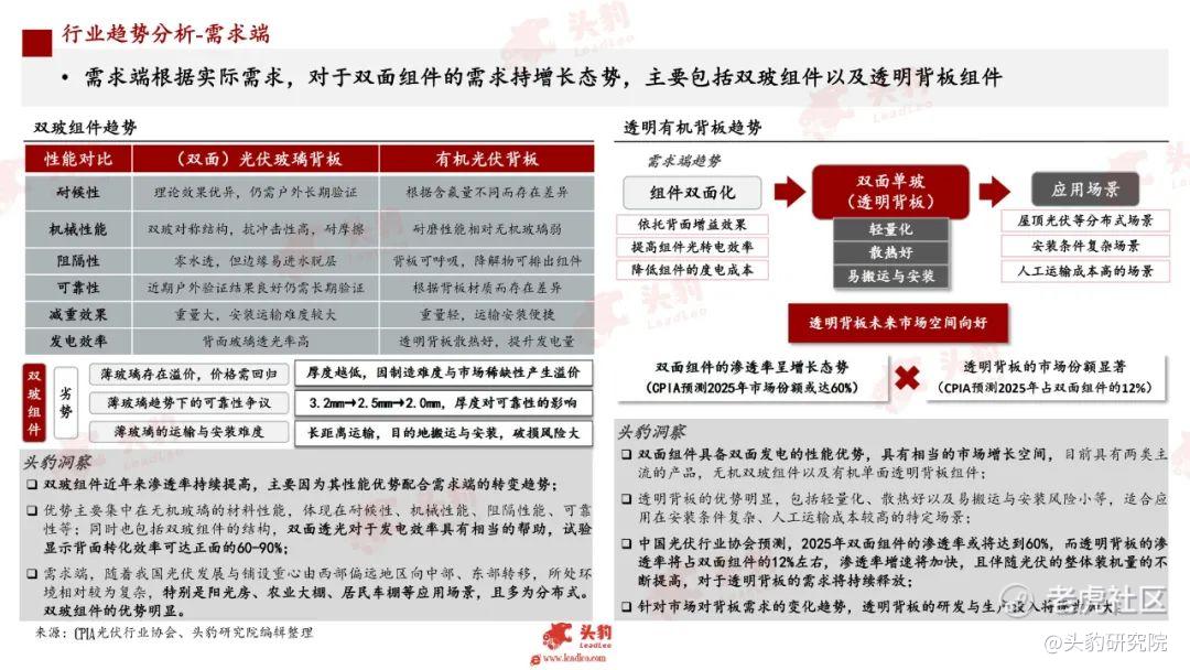 需求端根据实际需求,对于双面组件的需求持增长态势,主要包括双玻组件以及透明背板组件。