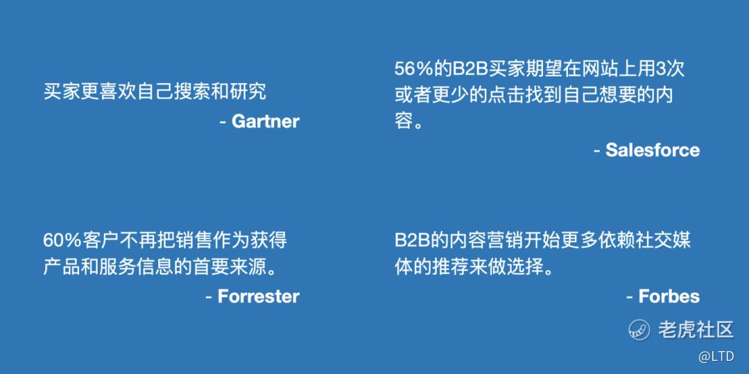 - 复杂化:B2C的可销售内容种类与形式越来越多;而B2B购买行为中,销售流程越发复杂,平均每次购买行为有7个利益相关方会影响最终的购买决策