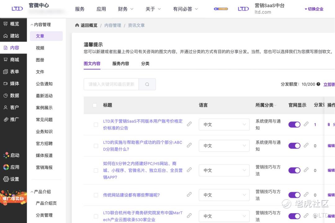 通过数字化官台,可以进⾏包括资讯、短视频vlog、产品介绍、客户案例、公告通知、常⻅问题、业务知识、招聘信息等多种应⽤场景内容的添加与编辑。这些应⽤场景的内容,可以在官微中⼼的内容栏⽬中集中呈现、取⽤与管理。