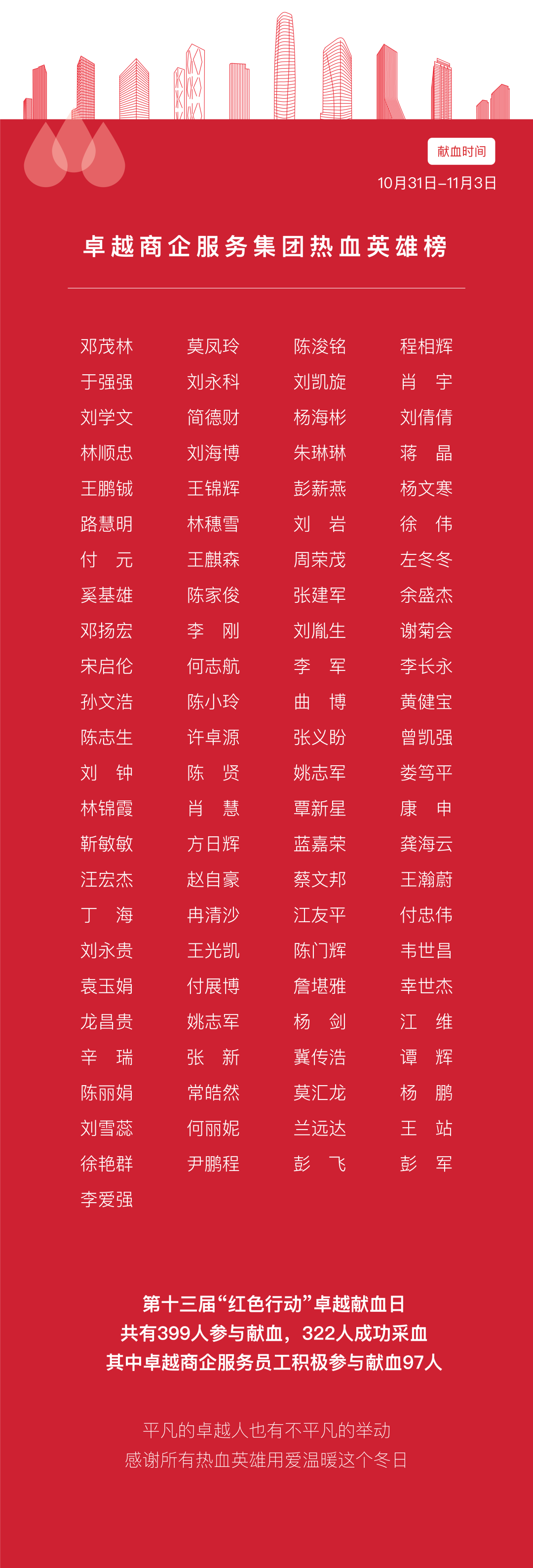 热血传递,爱在卓越。第十三届「红色行动」中积极参与献血的爱心人士达399人,共有322人成功采血,总献血量达113900毫升。虽然有77名英雄因身体原因未能成功采血,但是他们的爱心和勇气同样值得感恩和赞颂。