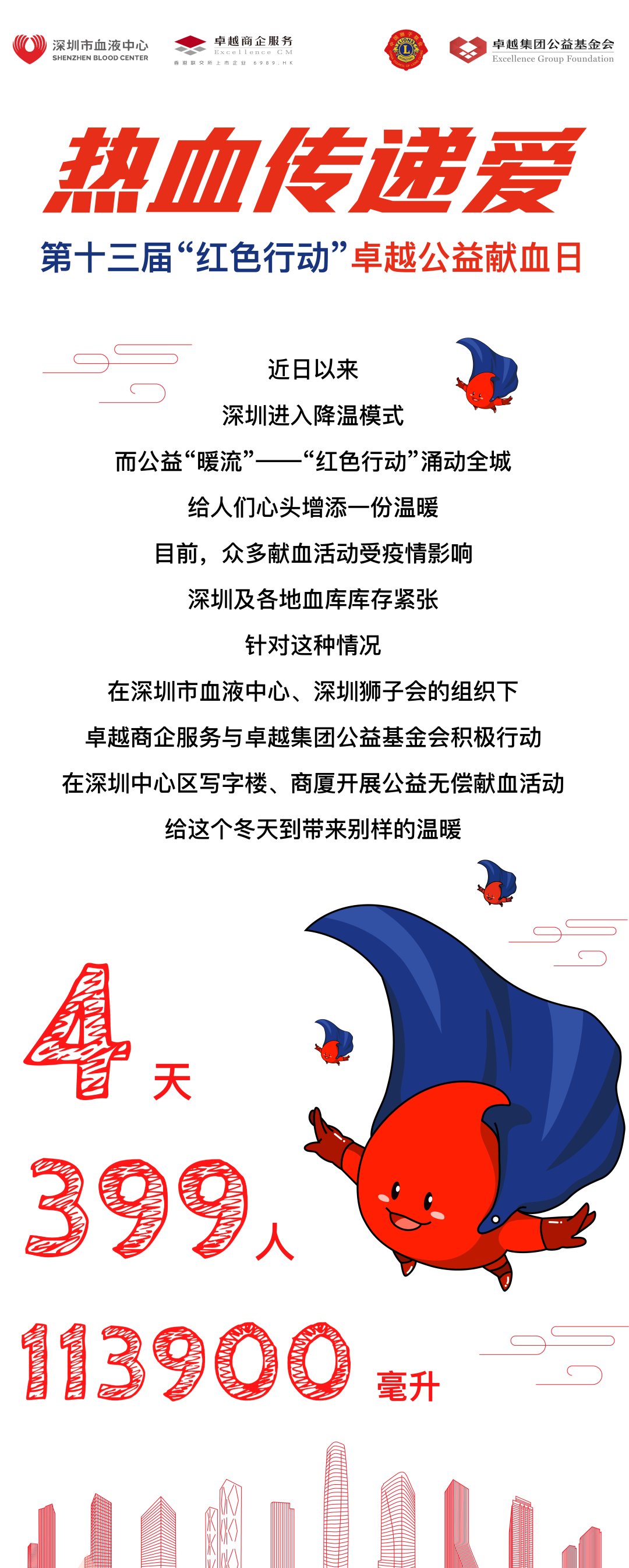 本次公益献血日活动,深圳市血液中心、深圳狮子会、卓越集团公益基金会联动卓越商企服务集团等各方社会力量,一起组织和参与公益活动并探索出卓有成效的模式。通过对本次活动亮点和实践的总结,卓越商企服务将积极推动客户、员工和社区共同参与,逐渐形成广泛发动公益力量的固定模式,以卓越行动传递爱心,以点滴善行点亮世界。