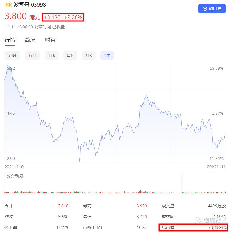 2022年11月11日收盘,波司登股价为3.8港元/股,市值413.72亿港元,一年时间内股价下跌了40%左右,蒸发约260亿港元(约合人民币240亿元)。
