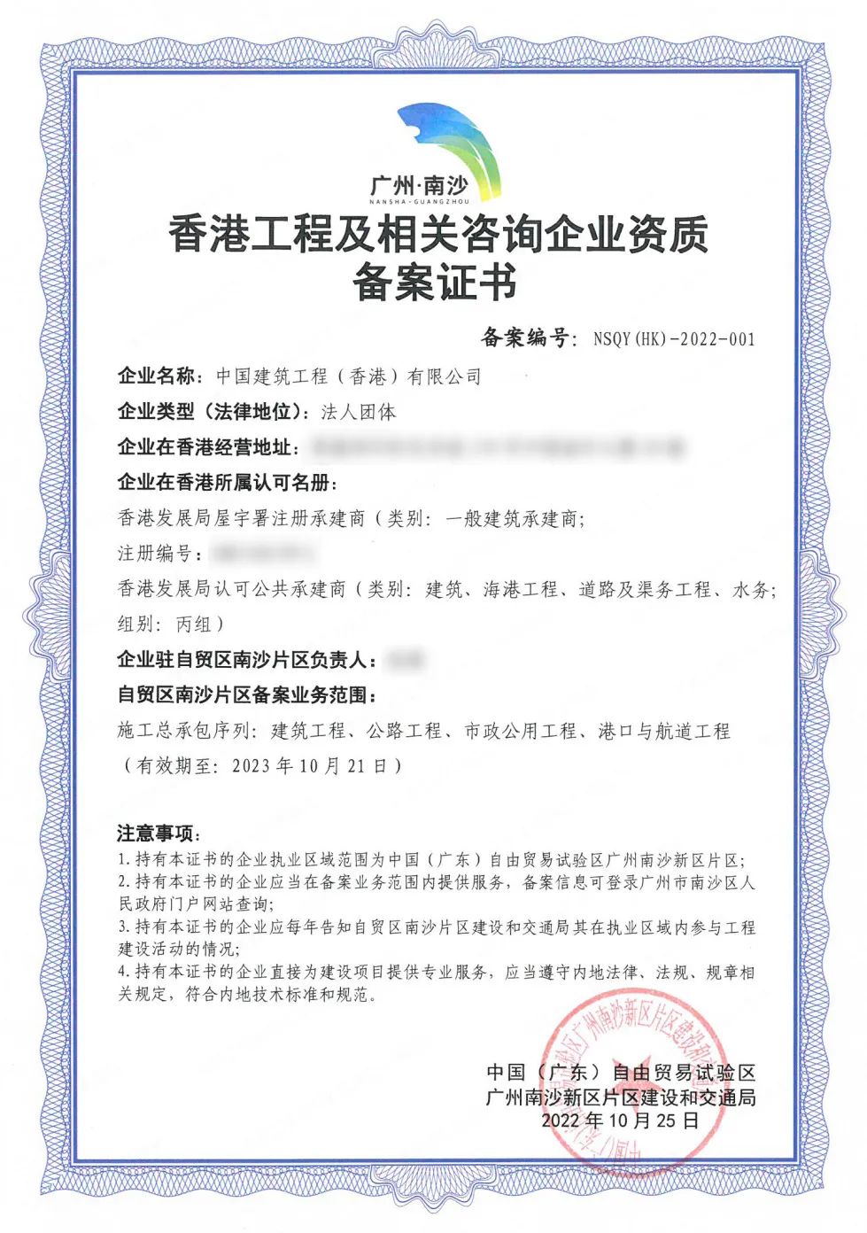 中建香港作为在港中资企业,积极响应国家政策,筹备优势资源,发挥示范作用,并率先取得广州南沙首张香港工程及相关咨询企业资质备案证书(备案编号NSQY(HK)-2022-001),助力粤港澳大湾区融合。