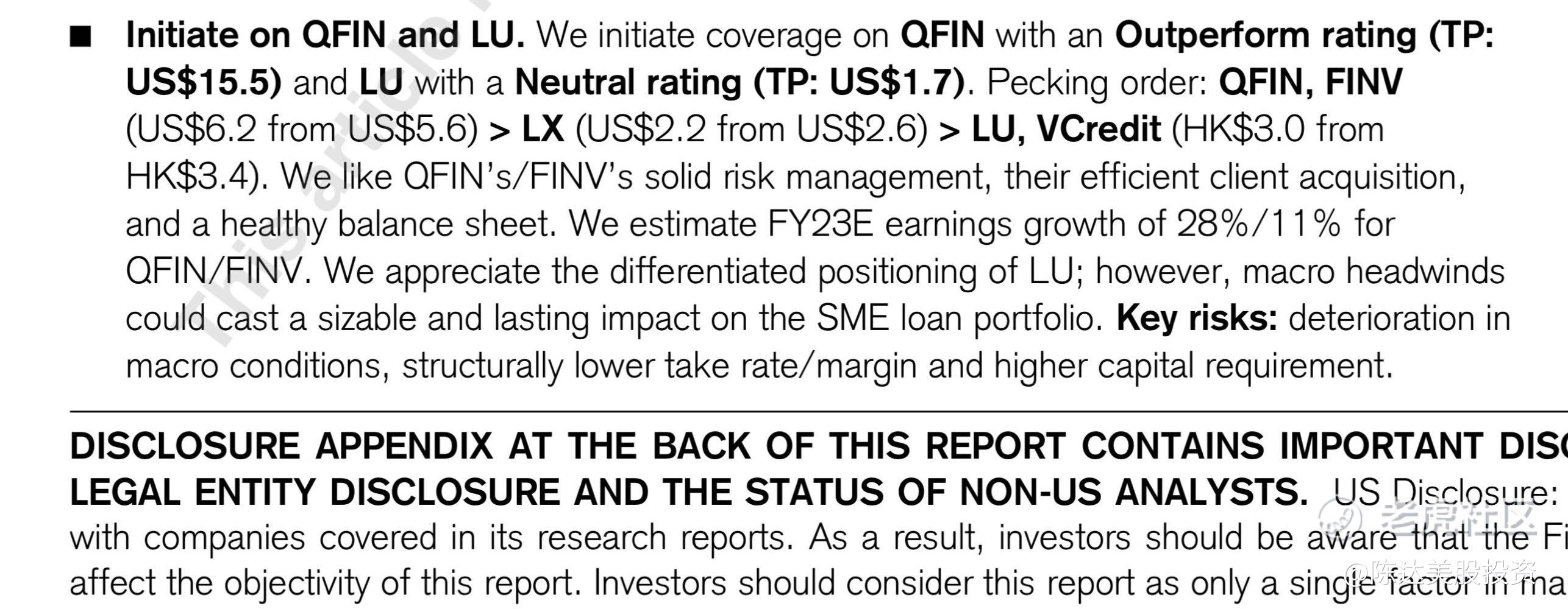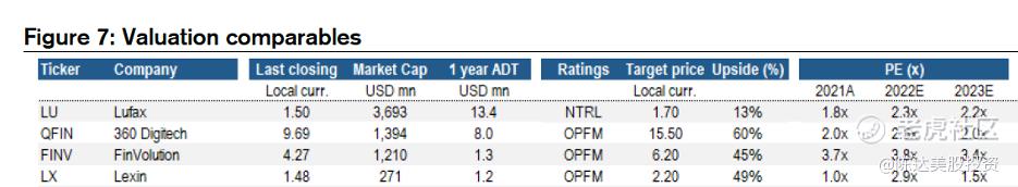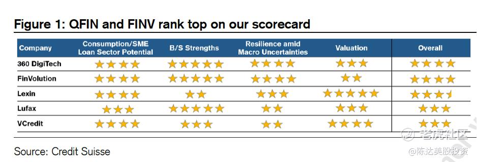 从规模成长潜力、资产负债表强度、抗周期韧性、估值水平来判断,瑞信给出的评分,360数科与信也,也是最佳标的(见最上面的那张星星图)。他给出的粗暴pecking order投资优先级顺序是,QFIN,FINV > LX >LU。