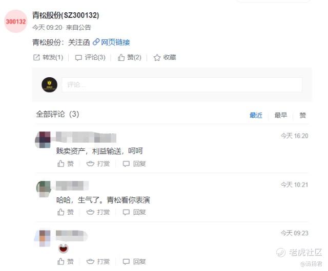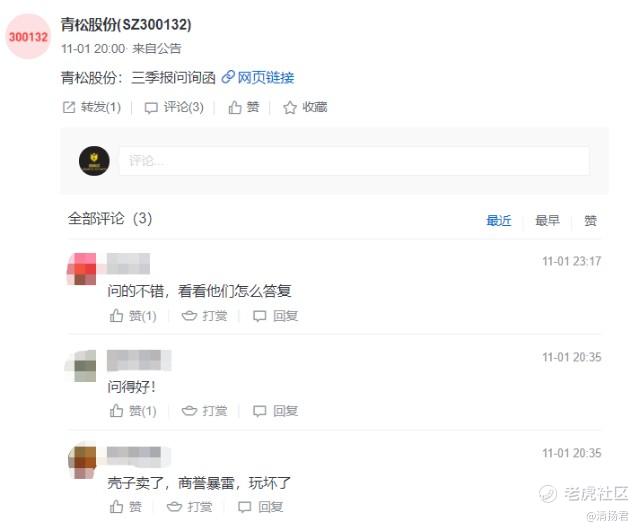 对于深交所的问询,不少投资者表示了支持,还有人调侃称“问的不错,看看他们怎么答复”、“壳子卖了,商誉暴雷,玩坏了”、“贱卖资产,利益输送”、“哈哈,生气了。青松看你表演”。