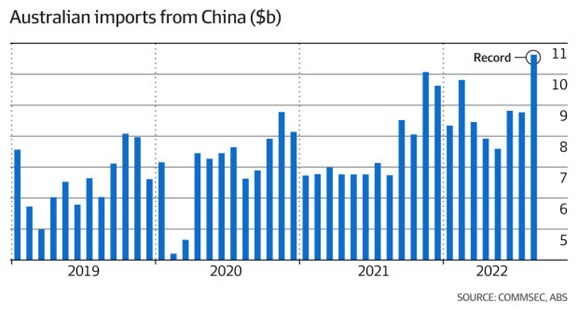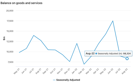来自澳大利亚统计局最新的贸易数据显示,8月份澳大利亚对中国的商品服务贸易进口额创历史新高,达到$106亿澳元,是自2019年以来单月进口贸易额的最高纪录,中国超越日本,美国和英国的总量,成为最大的单个国家进口贸易商。8月份,澳大利亚进口贸易总额为$484.5亿澳元,环比增长4.5%,出口贸易总额为$567.7亿澳元,环比增长2.6%。由于进口贸易激增,8月澳大利亚贸易顺差收缩至$83亿澳元,较6月份顺差高点$174.9亿大幅减少。