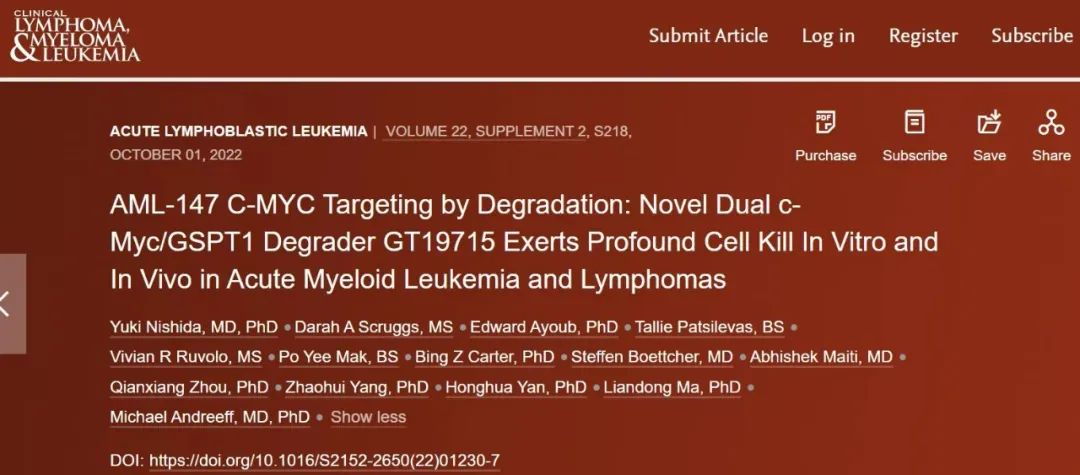 北京时间2022年10月13日,开拓药业(股票代码:9939.HK),一家专注于潜在同类首创和同类最佳创新药物研发及产业化的生物制药公司,宣布其联合美国德克萨斯大学MD安德森癌症中心(The University of Texas MD Anderson Cancer Center)已于2022年10月1日在Clinical Lymphoma, Myeloma & Leukemia期刊上发表最新成果,展示了开拓药业研发的新型C-Myc/GSPT1双靶点降解剂GT19715对急性髓系白血病(AML)和淋巴瘤的杀伤作用。